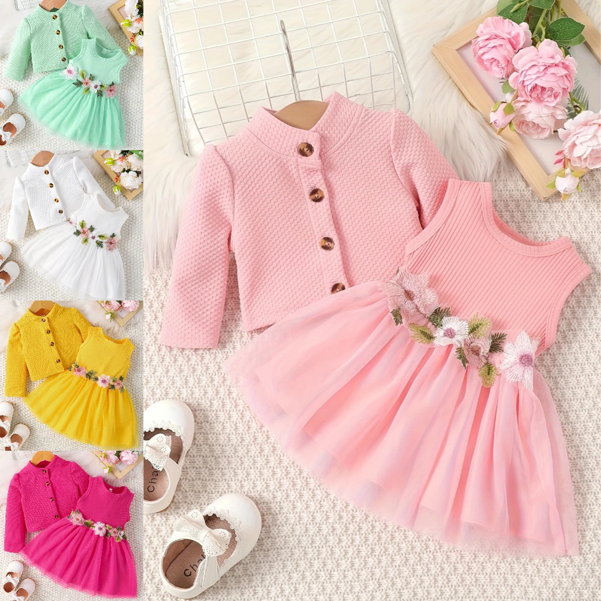 Baby girl waist flower design vest spliced mesh dress jacket for infants and young children