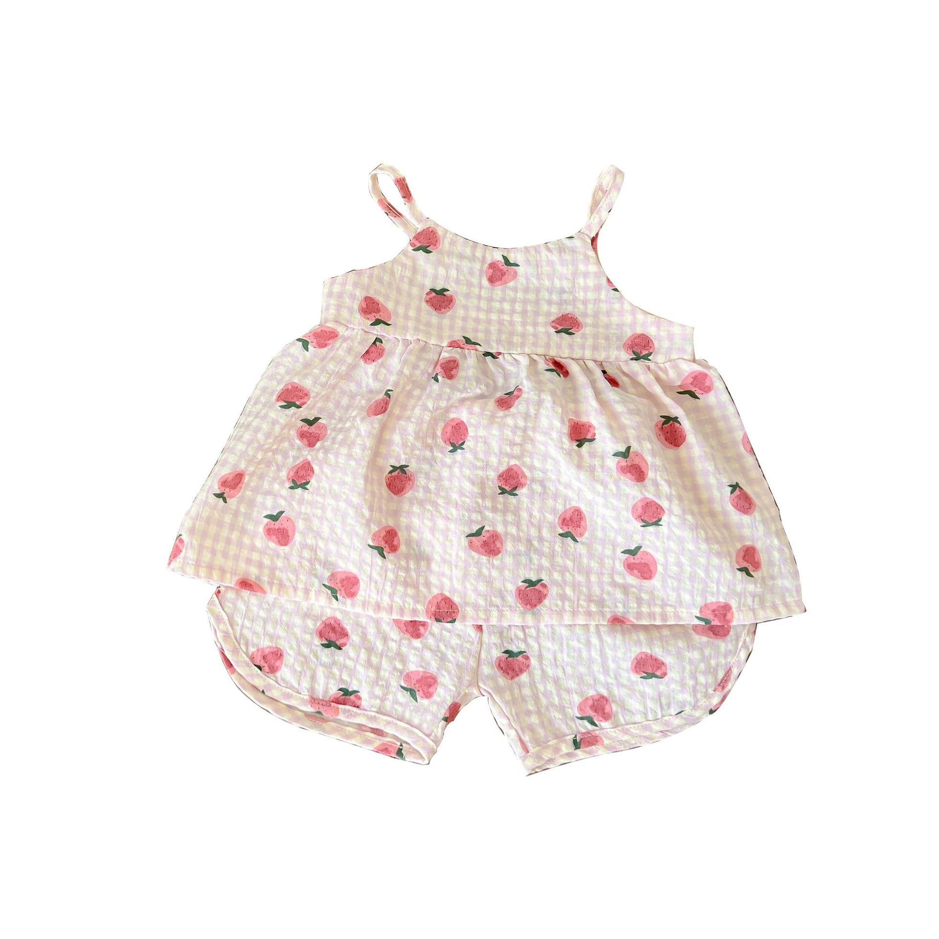 Baby Summer Full Print Bear Strawberry Sleeveless Suspender Top Shorts Two-Piece Cute Baby Summer Suit