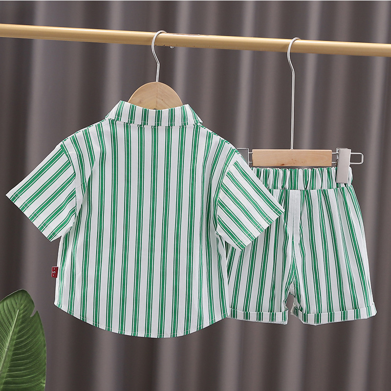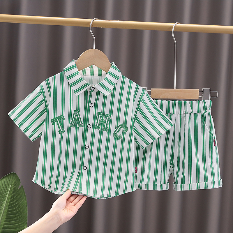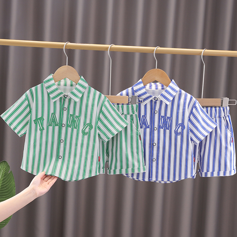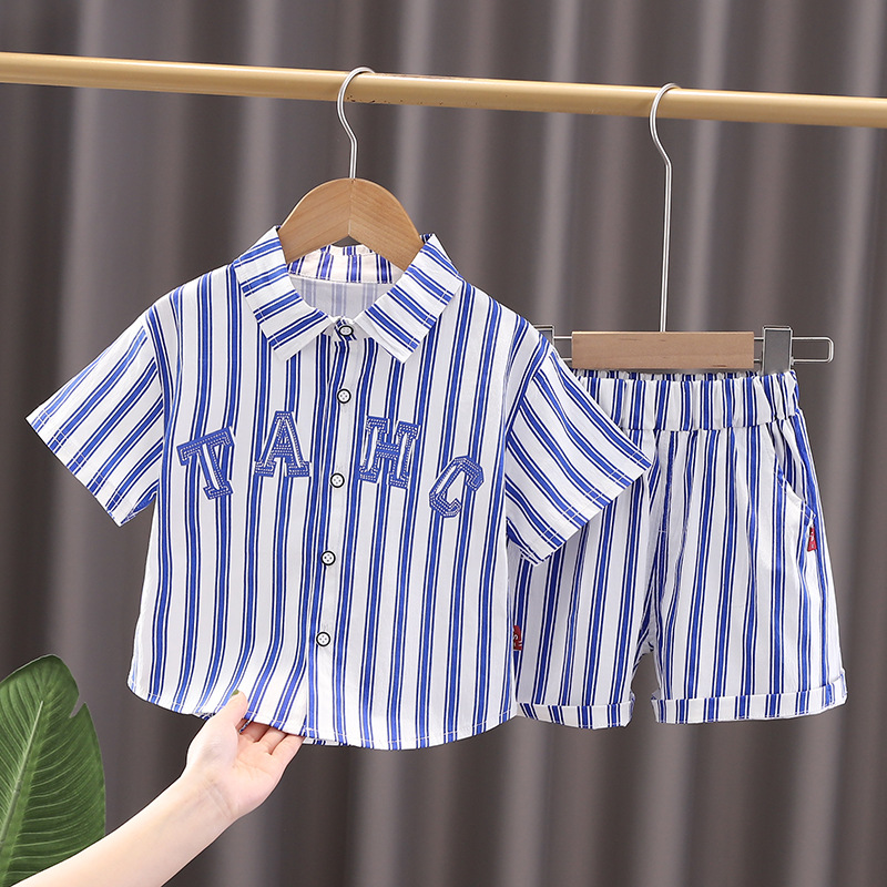 Children’s Suit Summer New Boy Baby Fashionable Vertical Striped Handsome Letter Short-Sleeved Shirt Two-Piece