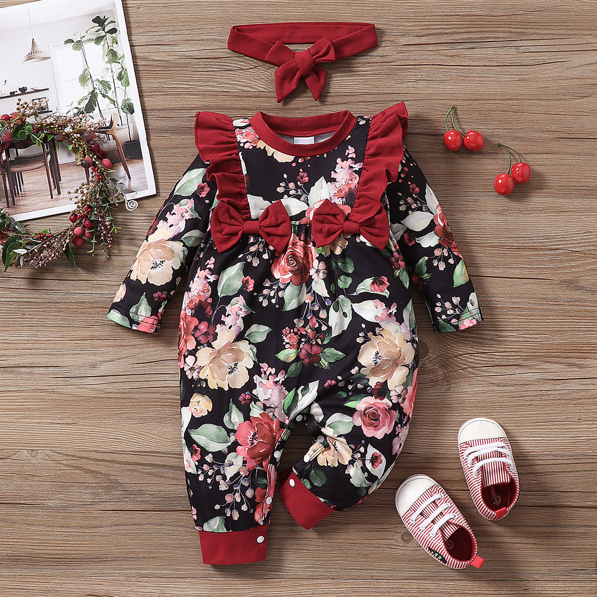 Infant Children’s Long-Sleeved Lace Bow Flower One-Piece Romper Girl Baby Autumn And Winter Romper