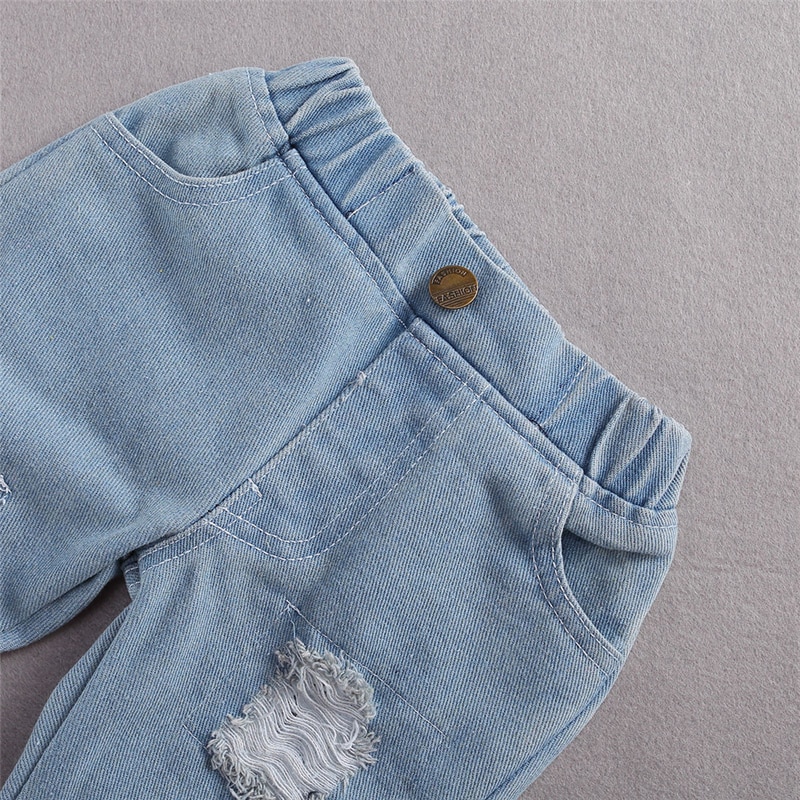 New Fashion Baby Girls Fall Clothes Long Sleeve Lace Romper Suit Triangle Crotch Lace Top Hole Long Jeans 2Pcs Outfit